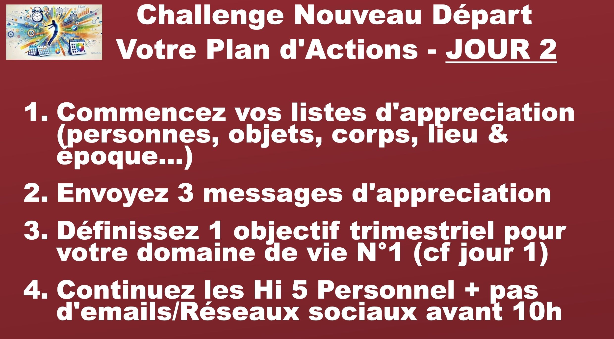 Connais-tu quelqu'un autour de toi qui a besoin de plus de CLARTE, plus de COURAGE, plus d'ENERGIE, plus de JOIE, plus de SENS, plus d'ACTION, plus de CONFIANCE en SOI ? Alors sois généreux et partage le lien d'inscription au challenge ;)